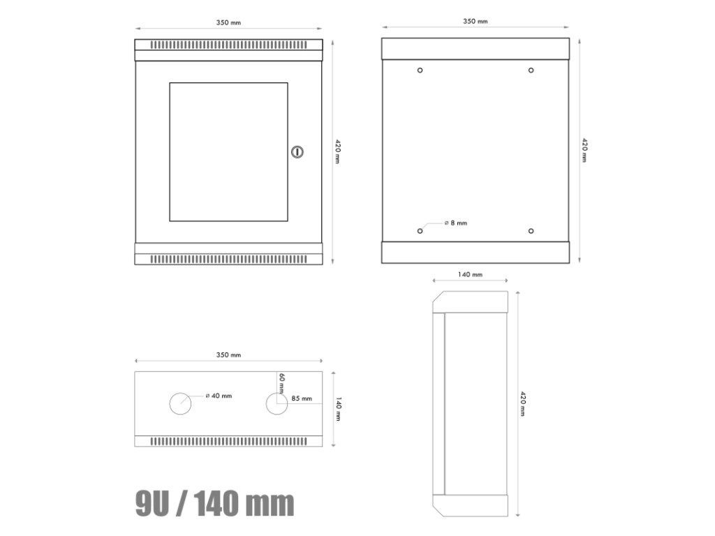 Rozvaděč obsahuje *přední posuvné 9U vertikální lišty *dveřní zámek + 2 klíče