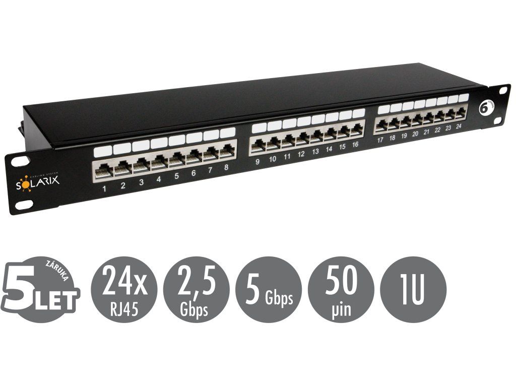 Patch panel Solarix s označením SX24-6-STP-BK je stíněný panel kategorie 6, který je osazen 24 porty RJ45 a duální IDC svorkovnicí 110/Krone. Kontakty jsou na svorkovnici odlišeny barvami podle typu zapojení, a to buď podle standardu T568A, nebo T568B. Tento panel z produktové řady Solarix – kategorie 6 bez problémů splňuje a rovněž převyšuje požadavky definované v mezinárodních standardech ANSI/TIA 568, ISO/IEC 11801 a EN 50173 pro kategorii 6 a třídu vedení Class E, včetně všech nejnovějších dodatků. Panel je navrhnut tak, aby byl robustní, spolehlivý, poskytoval maximální výkon a umožňoval jednoduchou instalaci. Součástí těla panelu je vyvazovací lišta, která umožňuje pevné uchycení a přehledné uspořádání datového kabelu. Barva stíněného patch panelu Solarix kategorie 6 je černá, velikost v datovém rozvaděči je 1U.