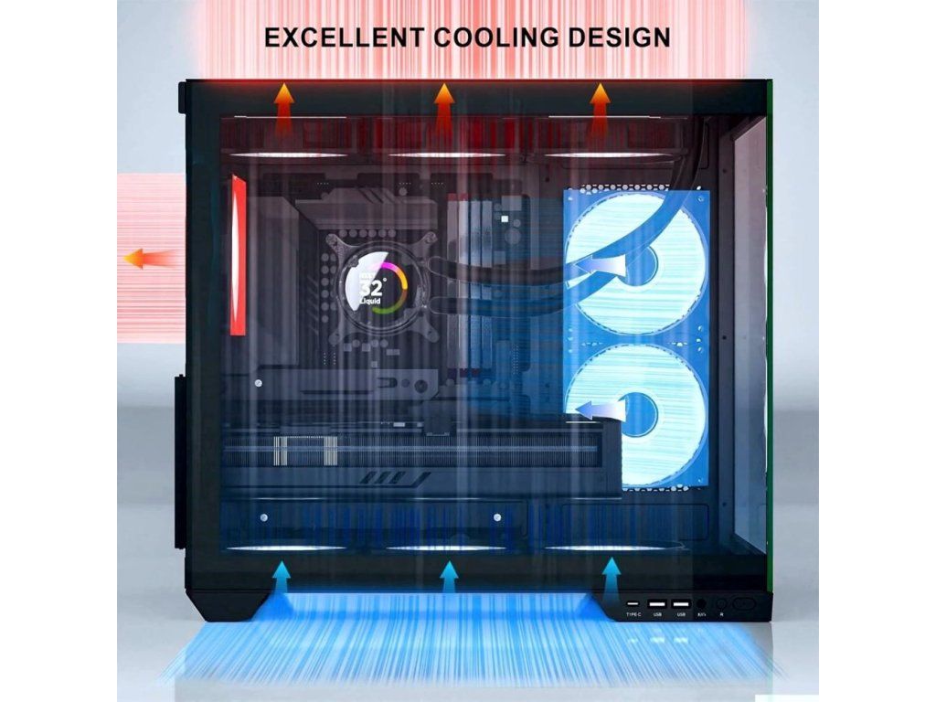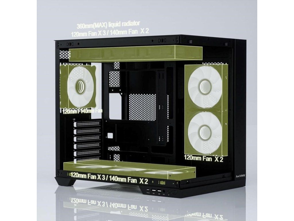 Navzdory kompaktným rozmerom ponúka priestor až pre 400mm dlhé grafické karty, 176mm vysoké chladiče a vodné chladenie až do veľkosti 360 mm. Vo vnútri nájdeš bohaté možnosti osadenia ventilátorov (až 9 kusov 120/140 mm), vyberať môžeš z niekoľkých variantov 1stCOOL ventilátorov vrátane aRGB riešenia, prípadne doplniť aj aRGB držiak grafickej karty.