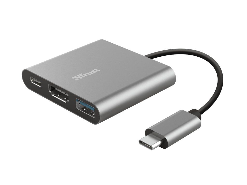 TRUST Dalyx 3-in-1 Multiport USB-C Adapter. Stylový hliníkový 3portový adaptér USB-C z hliníku pro přidání portů USB a HDMI a nabíjecího portu typu C do notebooku.Klíčové vlastnosti *Přidejte do svého notebooku další porty HDMI a USB a nabíjecí port USB-C pomocí jediného portu USB-C *HDMI port pro připojení monitoru nebo TV *Obrazy s vysokým rozlišením v bohatých barvách díky HDR a HDMI 1.4 (4K30Hz) *Port USB pro příslušenství, jako je klávesnice, myš a externí jednotka *Podporuje rychlost přenosu dat až 5 Gbps pomocí USB 3.2 Gen 1 *Port USB-C PD pro nabíjení notebooku s výkonem až 100 W *Odolné a stylové tlakové odlitky z hliníkové slitiny *Tenký a kompaktní, snadno přenosný při cestování