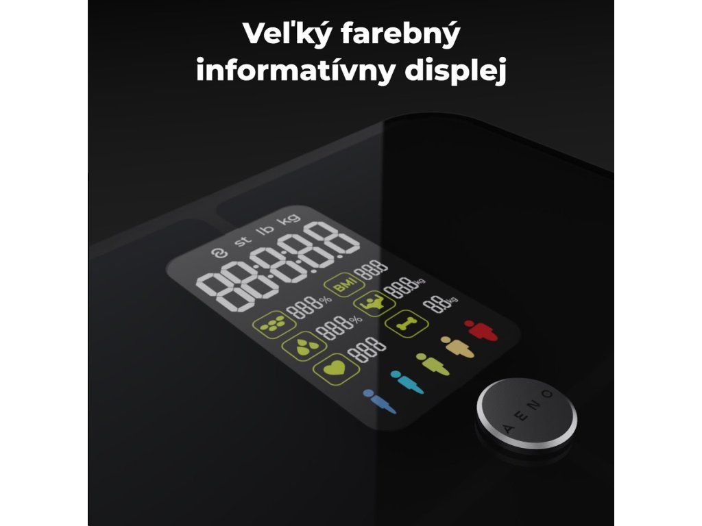 AENO Smart osobná váha ABS0002S, do 180kg, BMI, Srdcový tep, 15 indexov, BTTH, Aplikácia, Spec. sklo, farebný Displej