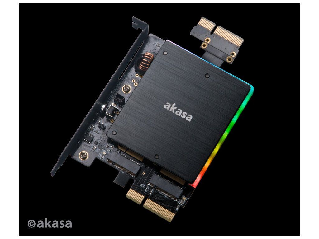 Tento adaptér převádí dva disky M.2 PCIe SSD tak, aby fungovaly v hlavní desce sběrnice PCIe x4, snižuje teplo SSD, přidává digitální adresovatelnou barvu RGB