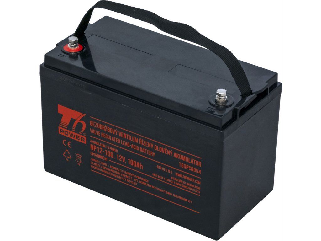 Napětí: 12 V Kapacita: 100 Ah Typ pólu: M6, M8 Šířka: 330 mm Výška: 220 mm Hloubka: 171 mm Hmotnost: 29.50 kg Životnost: 3-5 let Typ: VRLA Potřebujete opravdu silný zdroj energie? Pak je tu pro Vás Akumulátor T6 Power NP12-100 s kapacitou 100 Ah. Tento akumulátor patří mezi vysoko-kapacitní akumulátory. Díky své kapacitě je vhodným zdrojem záložní energie pro větší systémy UPS, například samostatně stojící skříňové UPS. Hojně jsou tyto akumulátory využívány jako záloha energie pro vysílače (access pointy) bezdrátového internetu. Akumulátor lze také používat jako primární zdroj energie pro větší elektromotory např. pro elektrická vozítka. Akumulátor české značky T6 Power NP12-100 připojíte k napájenému zařízení prostřednictvím zapuštěného závitu M8. Uzavřené bezúdržbové akumulátorové baterie VRLA nelze nabíjet běžnou nabíječkou na autobaterie. Pro nabíjení použijte vhodnou nabíječku na bezúdržbové baterie.Dodatočné parametre