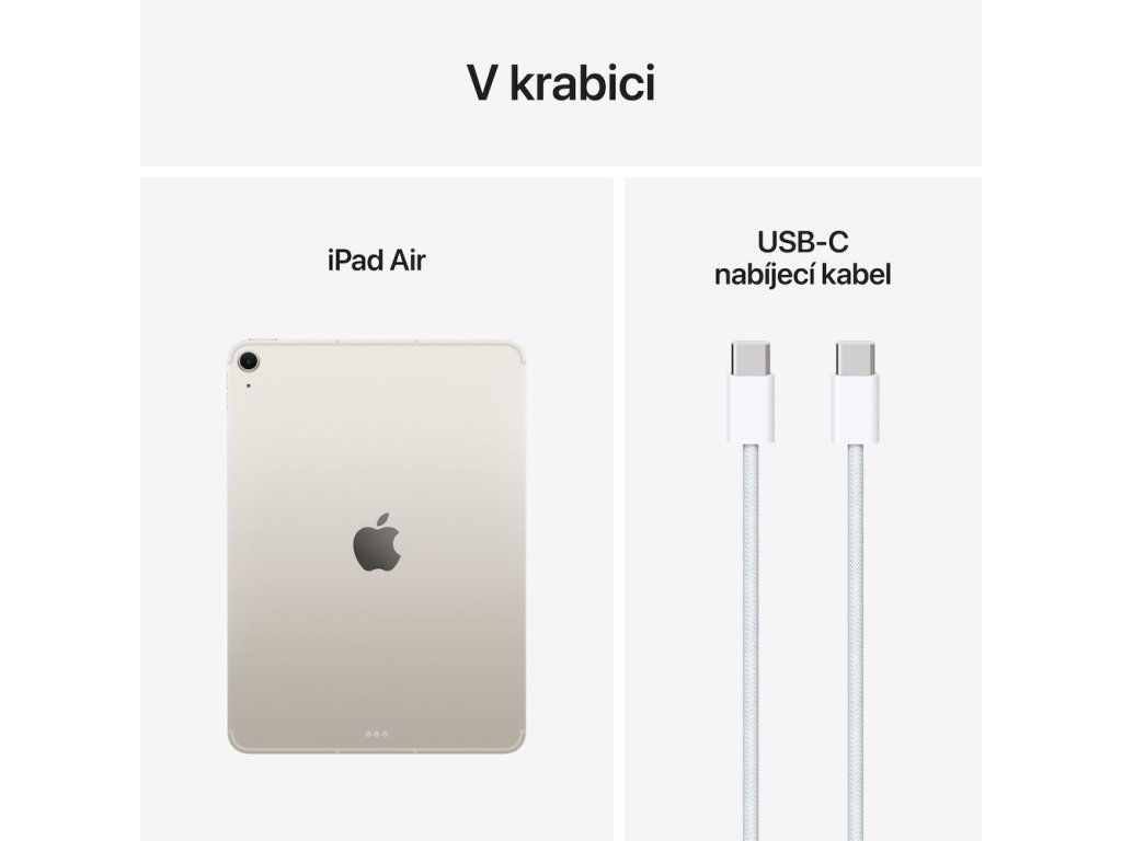 V krabici: * iPad Air * USB-C nabíjecí kabel (1m)