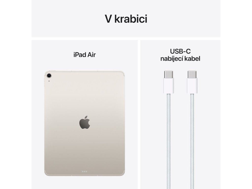 V krabici: * iPad Air * USB-C nabíjecí kabel (1m)