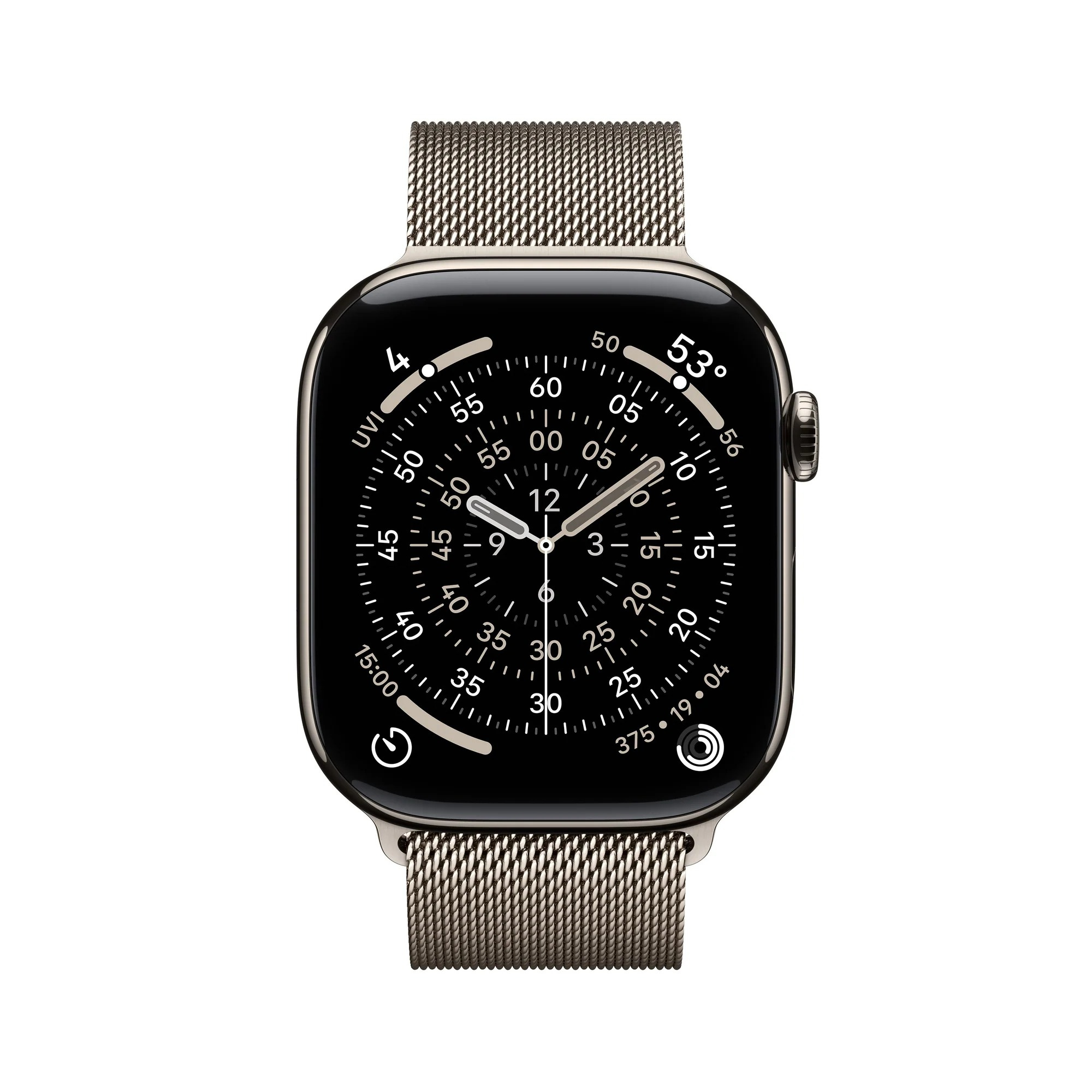 Apple Watch Series 11 Milanese Loop přírodní S/M * pro zápěstí s obvodem 140–245 mm * korunka Digital Crown s haptickou odezvou * reproduktor/mikrofon
