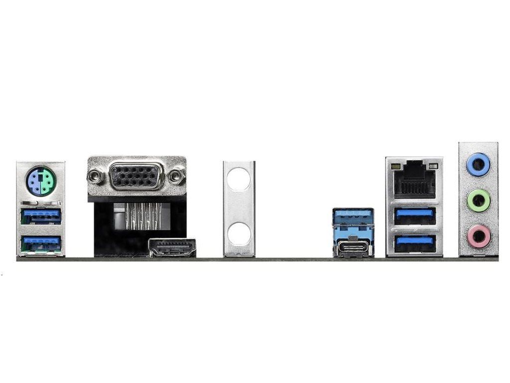 | Vstupy/výstupy na zadnom paneli | - Držiak antény - 1 x port PS/2 pre myš/klávesnicu - 1 x port D-Sub - 1 x port HDMI - 1 x USB 3.2 port typu A Gen2 (10 Gb/s) (podporuje ochranu proti prepätiu) - 1 x USB 3.2 Gen2 port typu C (10 Gb/s) (podporuje ochranu proti ESD) - 4 x USB 3.2 porty Gen1 (podporuje ochranu proti ESD) - 1 x port RJ-45 LAN s LED diódou (ACT/LINK LED a SPEED LED) - HD audio konektory: Line in / Predný reproduktor / Mikrofón |