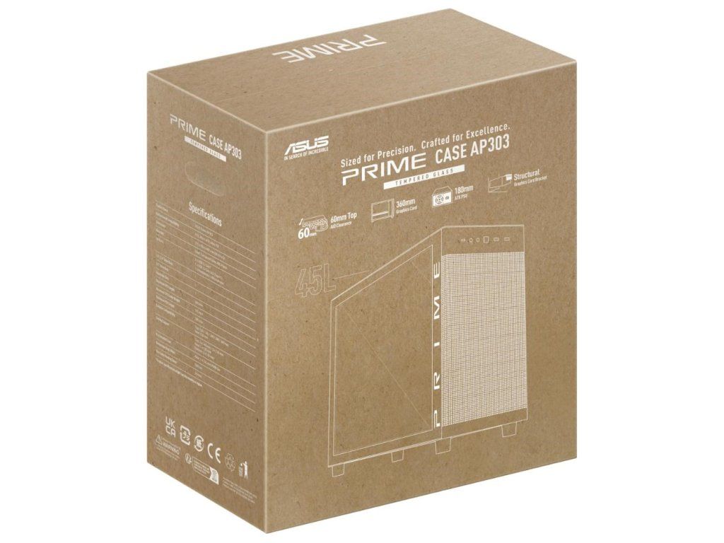 ASUS Prime AP303 je kompaktná ATX skriňa s objemom 44 litrov, ktorá podporuje grafické karty až do dĺžky 360 mm, radiátory až do 360 mm a hrúbky do 60 mm, ako aj ATX zdroje do dĺžky 180 mm.