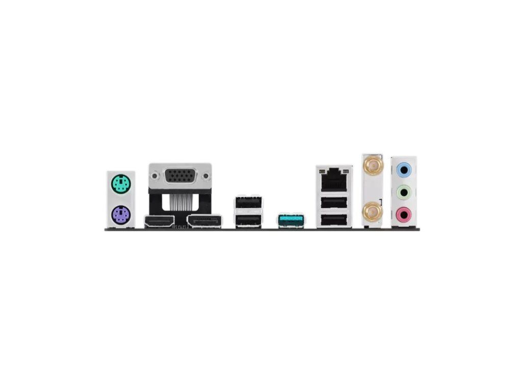 Porty na zadním panelu: * 1x USB 3.2 Gen 2 (1x typ-A) * 4x USB 2.0 (4x typ-A) * 1x DisplayPort * 1x HDMI® * 1x VGA * 1x modul Wi-Fi * 1x RJ-45 Intel® 1Gb * 3x audio jack * 1x PS/2 klávesnice (fialový) * 1x PS/2 myši (zelený)
