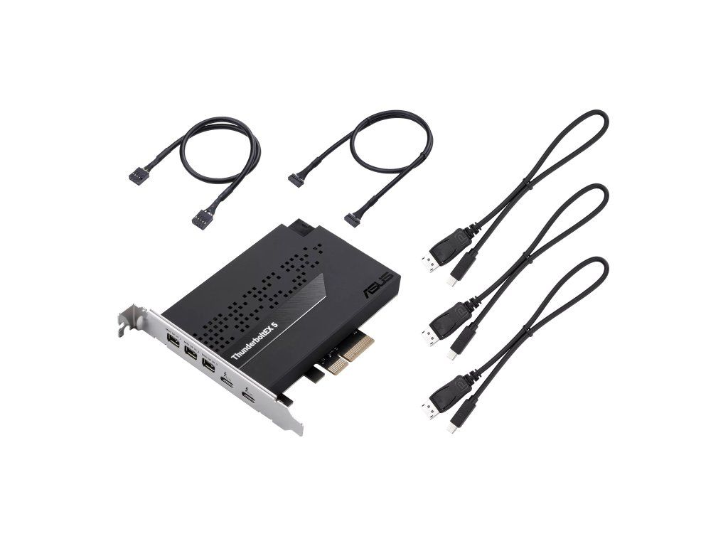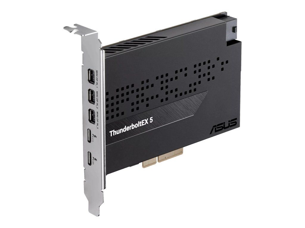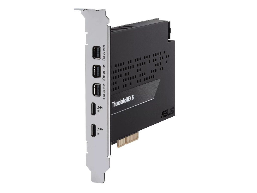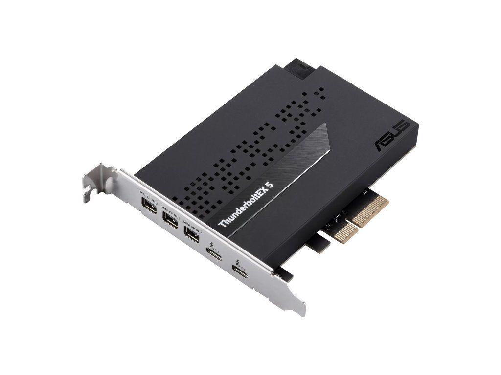 rozšiřující karta ASUS ThunderboltEX 5 přídavná karta Thunderbolt™ 5 s certifikací Intel® Karta ASUS ThunderboltEX 5 nabízí šířku pásma až 120 Gb/s Thunderbolt™ 5, podporu DisplayPort™ 2.1 s kompatibilním GPU, kompatibilitu s USB4® a navíc podporu až pěti zařízení Thunderbolt™. * bezproblémové sdílení mezi dvěma počítači pomocí Thunderbolt™ Share * rozhraní PCIe 4.0 x 4 * 6pinový napájecí konektor PCIe pro funkci Flexible FastCharge * podpora až 3x 8K@60Hz s DSC podle specifikace DisplayPort 2.1