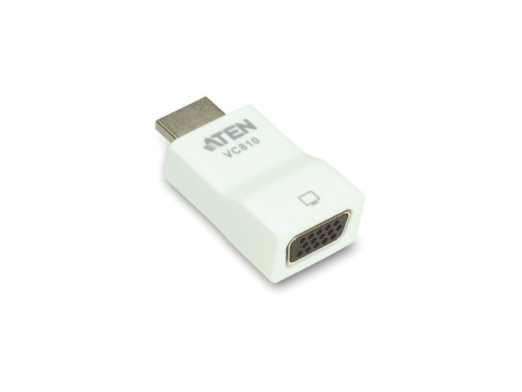 ATEN Konvertor HDMI na VGA rozhraní až 1080P Převodník VC-810 převádí signál z HDMI zdroje signálu na VGA (pouze v tomto směru), takže umožní zobrazovat signál z digitálního zdroje HDMI na analogovém VGA monitoru, televizi. Převodník je napájen z konektoru HDMI, nevyžaduje tedy další externí napájení. Není třeba ho nijak sofwarově instalovat. * převod signálu z HDMI na VGA * výborná kvalita videosignálu, až 1920 x 1200, 1080p * podpora širokoúhlých formátů obrazu * nevyžaduje napájení Konektory: HDMI vstup, samec VGA výstup, samice