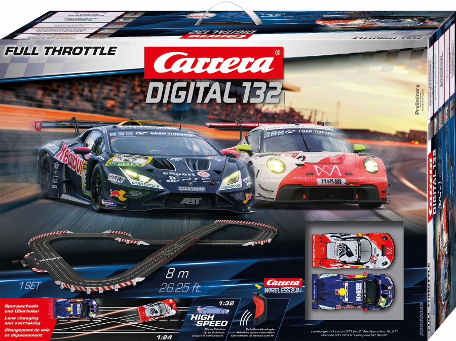 Autodráha Carrera Digital 132 dlhá 8m s autami GT3 Lamborghini Huracán a Porsche 911 obsahuje rovinky, zákruty, bezdrôtové ovládače> premos a sprava, napájací diel a ďalšie diely.