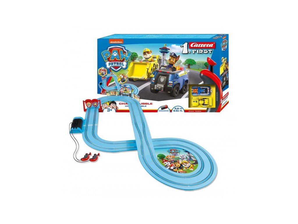 Autodráha Carrera FIRST dlhá 2,9m s autami zo seriálu Tlapková patrola, pre deti od 3 rokov, na batérie, obsahuje rovinky, zúženie dráhy, zatáčky, točiace vrtule, ovládače a dekorácie s tématikou Tlapková patrola.