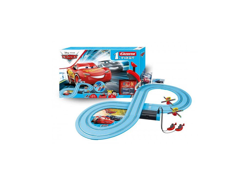 Autodráha Carrera FIRST dlhá 2,4m s autami Blesk McQueen a Jackson Storm z filmu CARS, pre deti od 3 rokov, na batérie, obsahuje rovinky, zatáčky, točiace vrtule, ovládače a dekorácie s tématikou CARS.Dĺžka trate: 2,4m