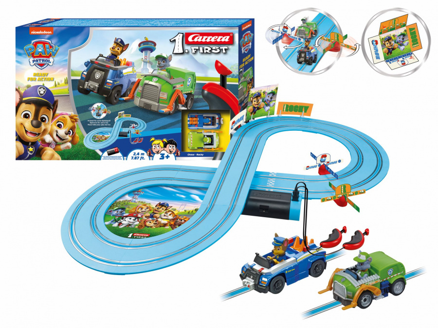 Autodráha Carrera FIRST 2,4 m dlhá s autíčkami zo série Paw Patrol, pre deti od 3 rokov, na batérie, obsahuje rovinky, zákruty, točiace sa vrtule, ovládače a dekorácie s motívom Paw Patrol.