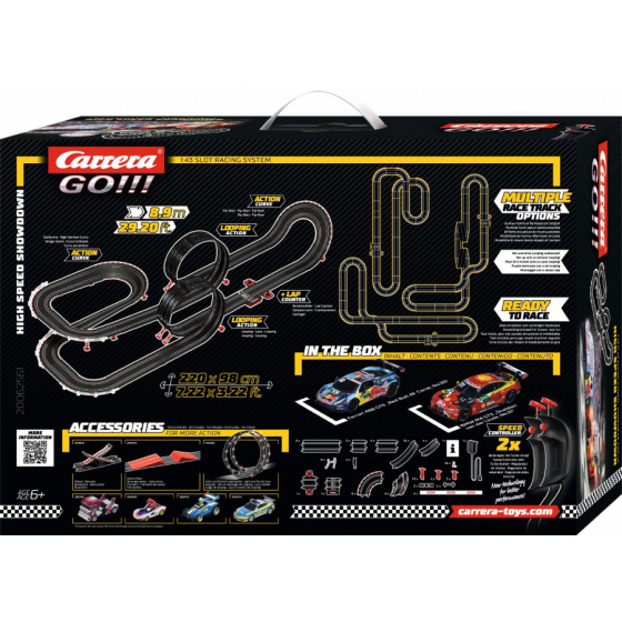 Autodráha Carrera GO!!! dlhá 8,9m s autami BMW M4 GT3 a Ferrari 488 GT3, obsahuje dva loopingy, klopenú zatáčku, kolmú stenu, rovinky, zatáčky, diel s počítadlom kôl a ďalšie diely. Môžete si zostaviť ďalšie rôzne trate podľa svojej fantázie.