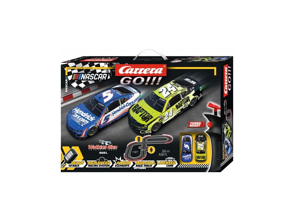 Autodráha Carrera GO!!! dlhá 3,6 m s autíčkami NASCAR Camaro, obsahuje, križovatku, rovinky, zákruty, počítadlo kôl a ďalšie diely. Môžeš si postaviť ďalšie rôzne trate podľa svojej fantázie.Dĺžka dráhy: 3,6 m