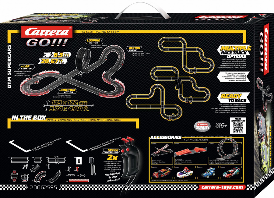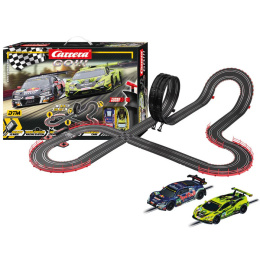 Autodráha Carrera GO!!! dlhá 6,3 m s vozidlami radu GT3 Audi R8 LMS a Lamborghini Huracán obsahuje križovatku, rovinky, zákruty, klopenú zákrutu, looping, počítadlo kôl a ďalšie časti. Môžete si postaviť ďalšie rôzne trate podľa svojej fantázie.