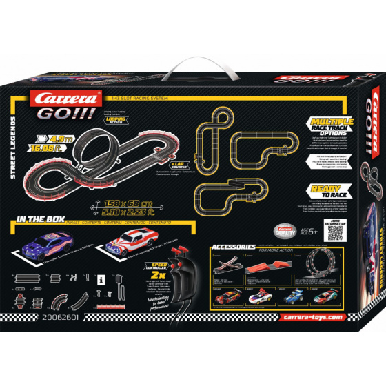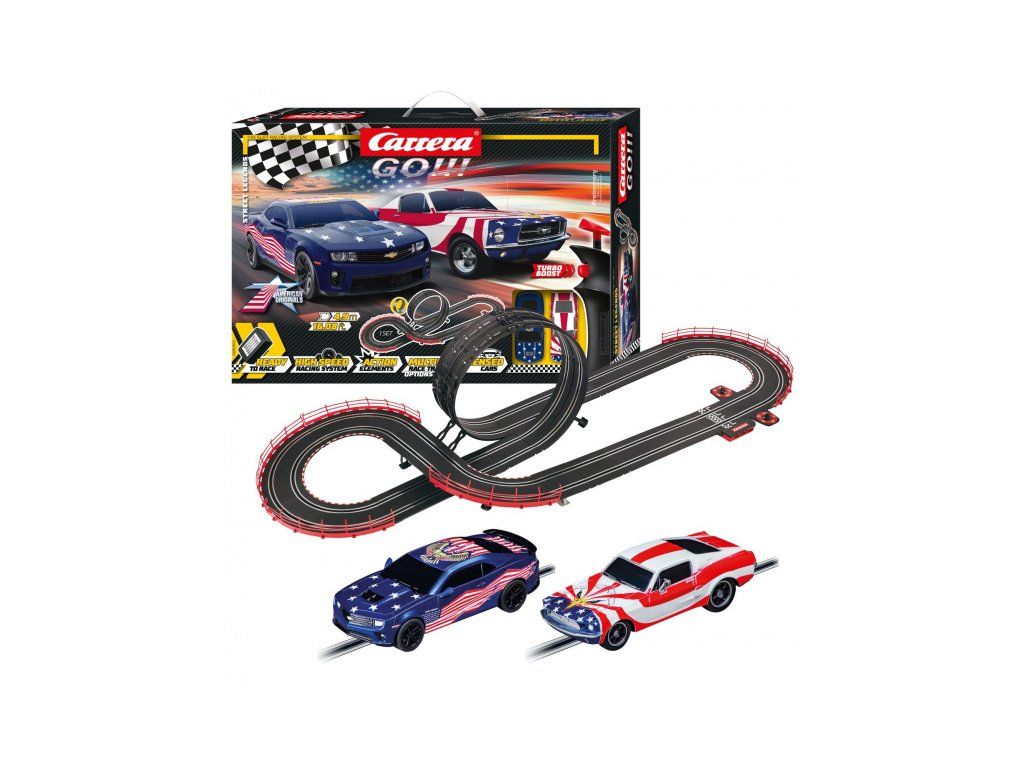Autodráha Carrera GO!!! dlhá 4,9 m s autami Ford Mustang ´67 a Chevrolet Camaro, obsahuje premostenie, rovinky, zákruty, looping, diel s počítadlom kôl a ďalšie časti. Môžete si postaviť ďalšie rôzne trate podľa svojej fantázie.