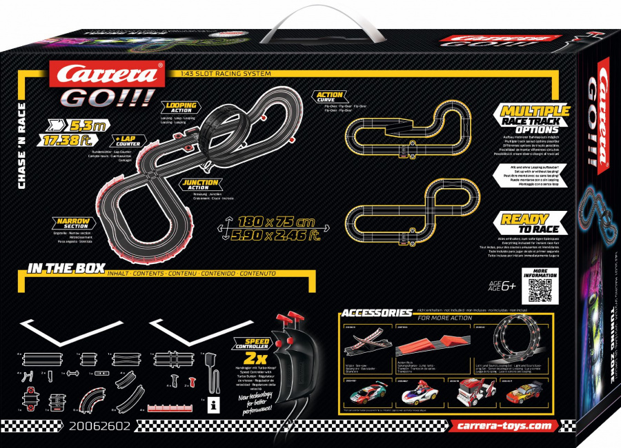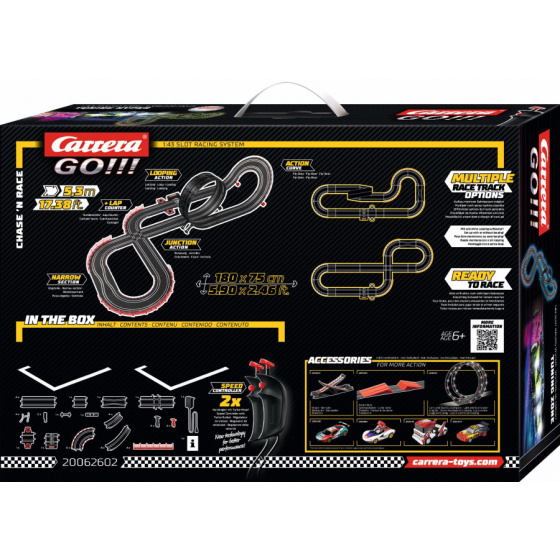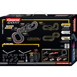 Autodráha Carrera GO!!! dhlá 5,3 m s autami Hypercars, obsahuje križovatku, rovinky, zákruty, kolmú stenu, zúženie dráhy, looping, diel s počítadlom kôl a ďalšie časti. Môžete si postaviť ďalšie rôzne trate podľa svojej fantázie.