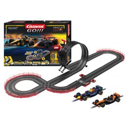 Autodráha Carrera GO!!! dlhá 5,3 m s vozidlami F1 Red Bull a McLaren, obsahuje križovatku, rovinky, zákruty, looping, diel s počítadlom kôl a ďalšie časti. Môžeš si postaviť ďalšie rôzne trate podľa svojej fantázie.