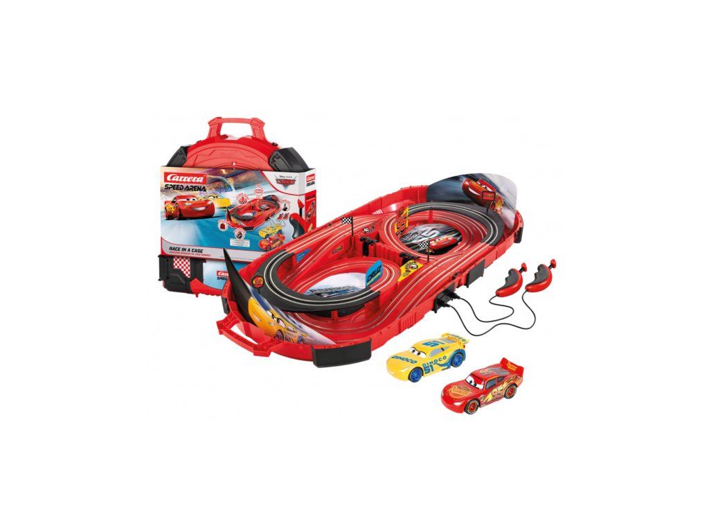 Carrera Speed Arena dlhá 2,77 m s autíčkami Blesk McQueen a Dinoco Cruz, pre deti od 3 rokov, na batérie (4xAA alebo dobíjanie cez USB-C). Autodráha je zabalená v prenosnom kufríku a obsahuje rovinky, zákruty, vodičov, zabudované počítadlo kôl a dekorácie s motívom Disneyho áut.Dĺžka dráhy: 2,77 m