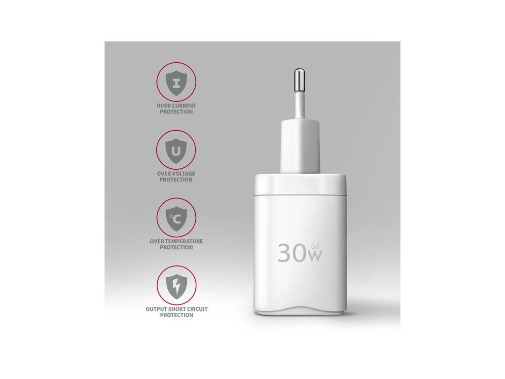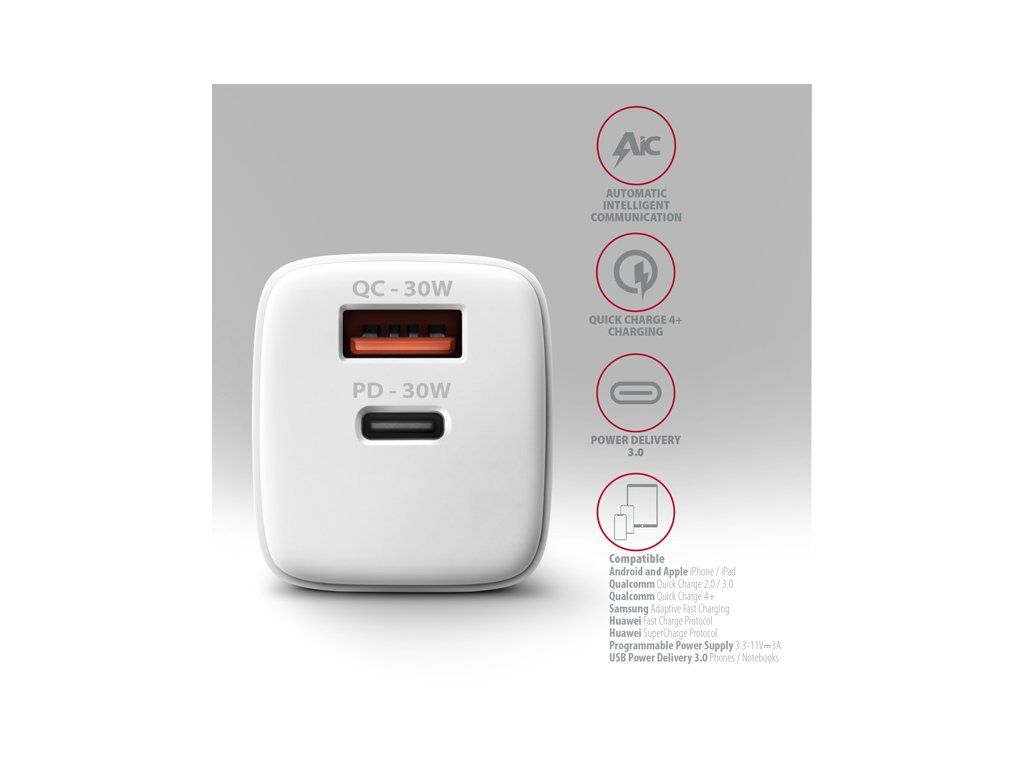výkonu 30W nabíječka dobíjí telefony, tablety a další mobilní zařízení nejvyšší možnou rychlostí. Adaptér nabízí nejen standardní
