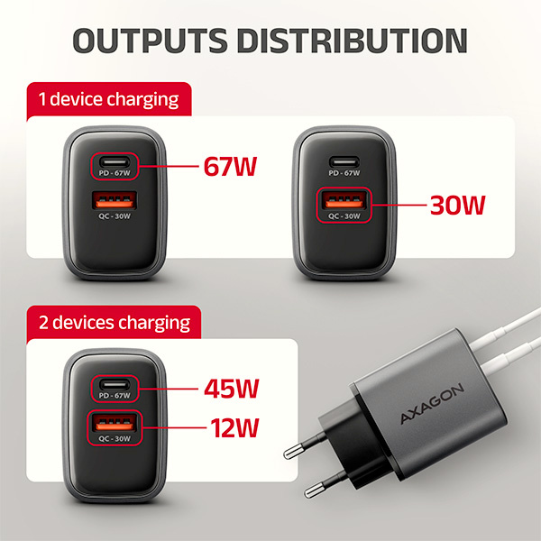 Popis AXAGON ACU-PQ67, GaN nabíjačka do siete 67W, výstup USB-A+USB-C, PD3.0/PPS/QC4+/SFC2.0/Apple