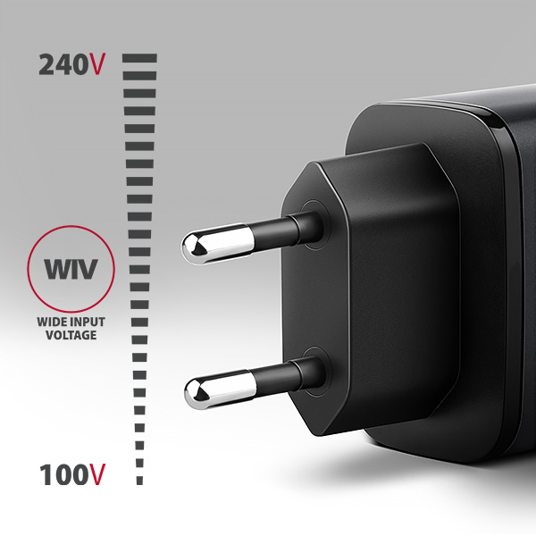 velikost této nabíječky až o polovinu menší. Kombinace malých rozměrů, dosažených pomocí GaN technologie, a širokého rozsahu vstupního napětí, dělá z této nabíječky ideálního pomocníka na cesty.