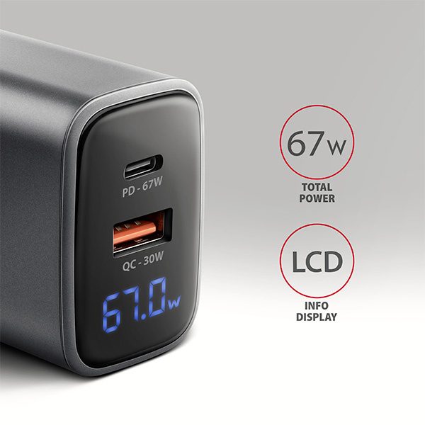 Popis AXAGON ACU-PQ67D, GaN nabíjačka do siete 67W, výstup USB-A+USB-C, PD3.0/PPS/QC4+/SFC2.0/Apple, LCD
