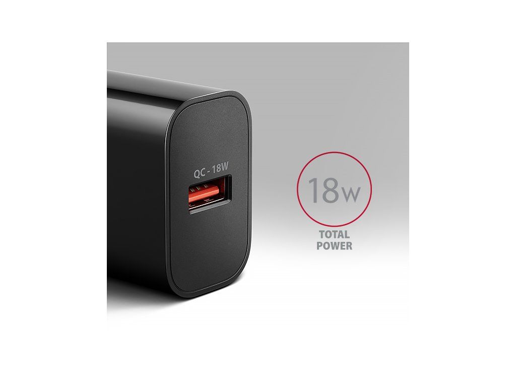 výkonu 18W dokáže nabíječka dobíjet telefony, tablety a další mobilní zařízení nejvyšší možnou rychlostí. Adaptér nabízí standardní