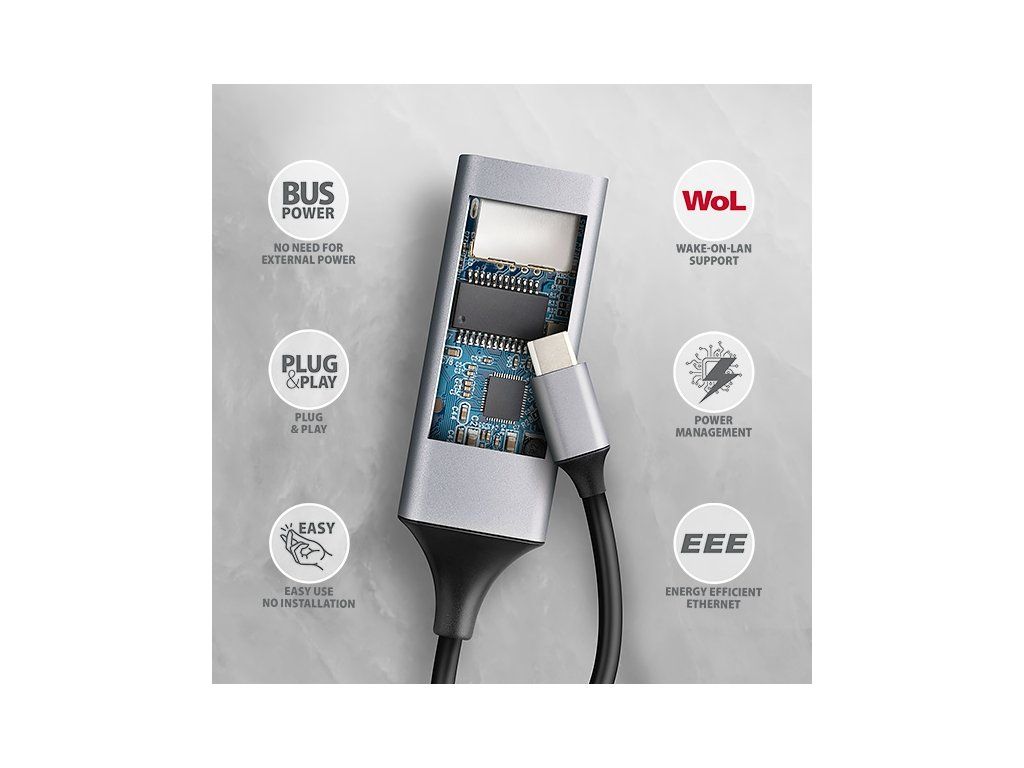 AXAGON ADE-TXPD, USB-C 3.2 Gen 1 - Gigabit Ethernet sieťová karta, Asix AX88179, PD 100W, auto inštal