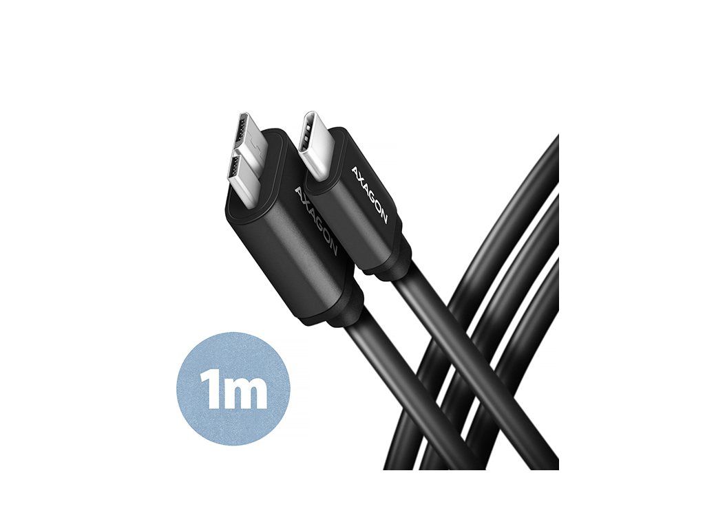 AXAGON BUMM3-CM10AB SPEED USB 3.0 kabel s konektory Micro-B USB male a USB-C male. Kabel je navržen pro rychlé datové přenosy a napájení externích pevných disků a dalších mobilních zařízení. Podporuje