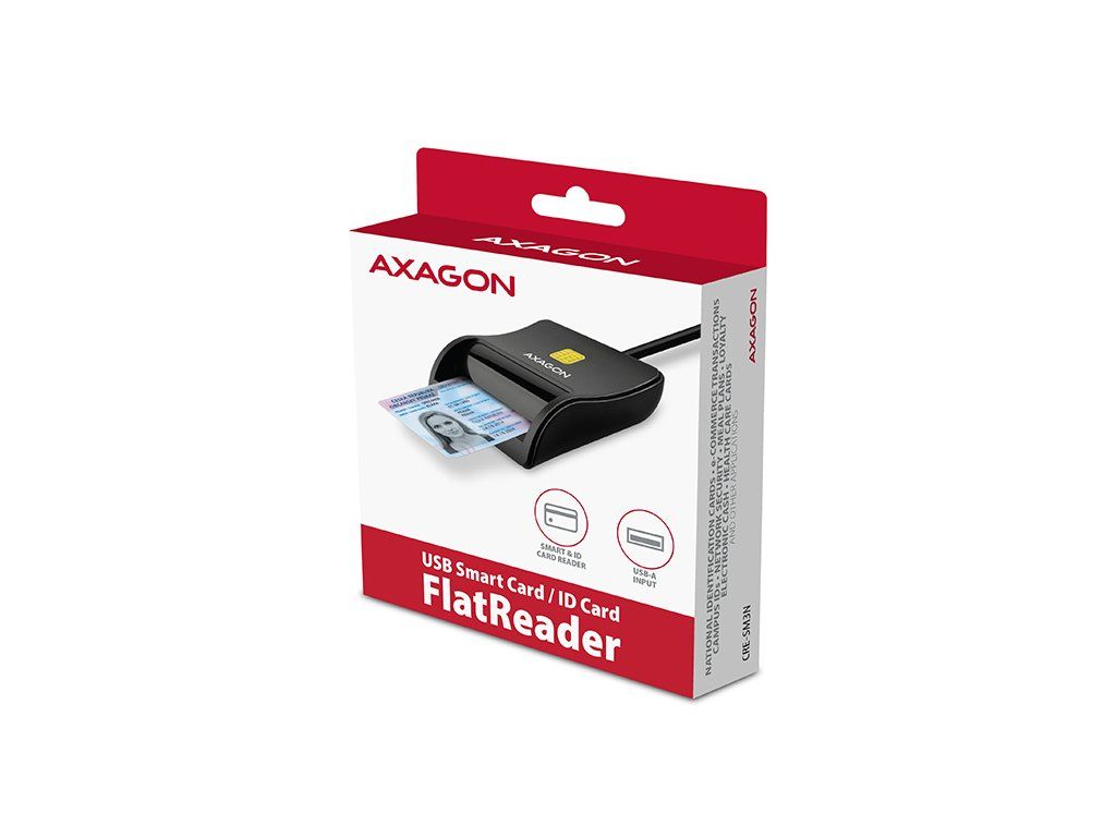 Kompaktní stolní čtečka Smart card / ID cardAXAGON CRE-SM3N FlatReader s USB 2.0 rozhraním. Card reader podporuje všechny běžné formáty
