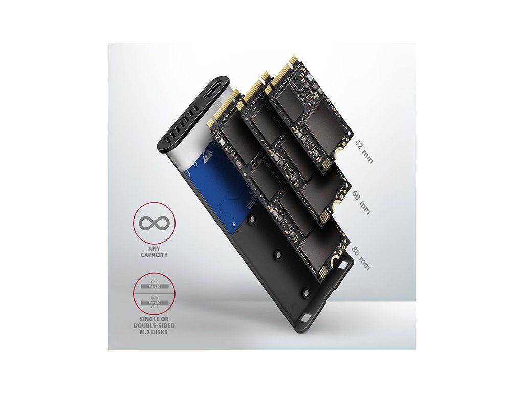 tři různé délky SSD karet - 42, 60 a 80 mm. M.2 karty mohou být jednostranné nebo oboustranné. Box nemá omezení kapacity vloženého SSD disku.