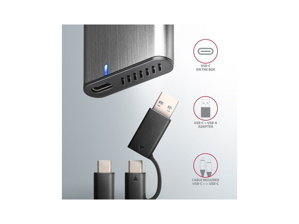 oboustranný USB-C konektor na boxu. V balení naleznete nejen kabel USB-C -> USB-C pro připojení boxu k počítači, ale také USB-C -> USB-A redukci. Můžete tak box připojit k jakémukoliv volnému USB portu na notebooku. Druhá generace rychlého USB rozhraní dovolí užívat si rychlost moderních M.2 SSD disků. Díky USB 3.2 Gen 2 rozhraní je přenosová