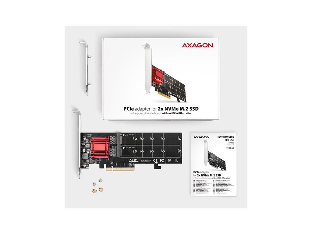 AXAGON PCEM2-ND, PCIe x8 radič - 2x M.2 NVMe M-key slot, RAID, podpora dosiek bez bifurkácie, vr. LP