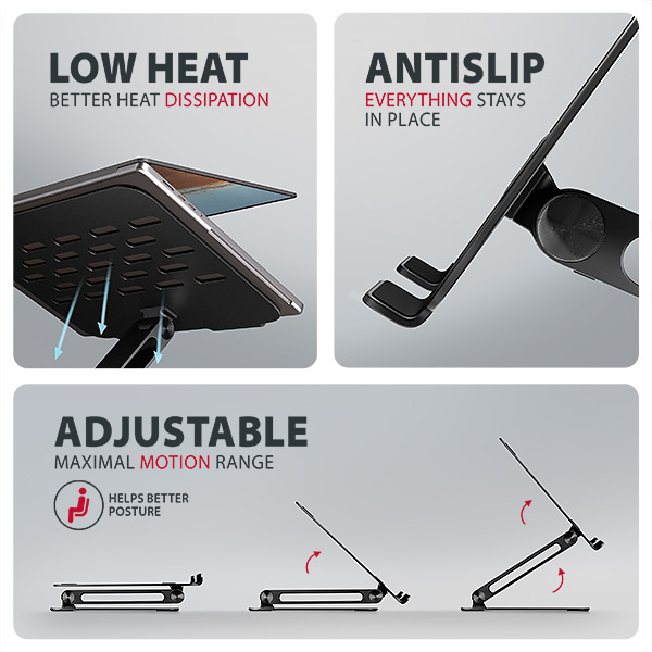 ideální sklon stojanu pro maximální uvolnění vašich krčních a zádových svalů. Užijte si komfortní pracovní prostředí s kompaktním a přenosným stojanem, který se dokonale přizpůsobí vašim potřebám, ať už pracujete doma, v kanceláři, nebo na cestách. Podstavec je vyroben z