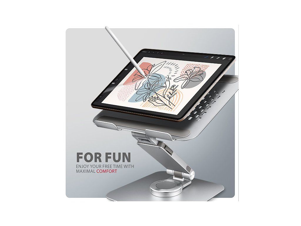 ideální výšku a úhel pro uvolnění krčních a zádových svalů. Díky 360° mechanismu a výsuvnému ramenu se dokonale přizpůsobí vašim potřebám ať už pracujete doma, v kanceláři, nebo na cestách. Kompaktní a přenosný design stojanu vám zajistí komfortní pracovní prostředí kdekoliv.