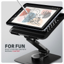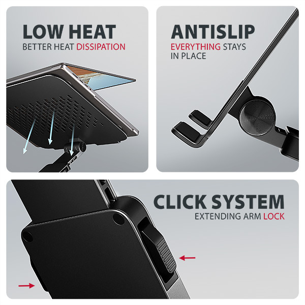 ideální výšku a úhel pro uvolnění krčních a zádových svalů. Díky 360° mechanismu a výsuvnému ramenu se dokonale přizpůsobí vašim potřebám ať už pracujete doma, v kanceláři, nebo na cestách. Kompaktní a přenosný design stojanu vám zajistí komfortní pracovní prostředí kdekoliv.