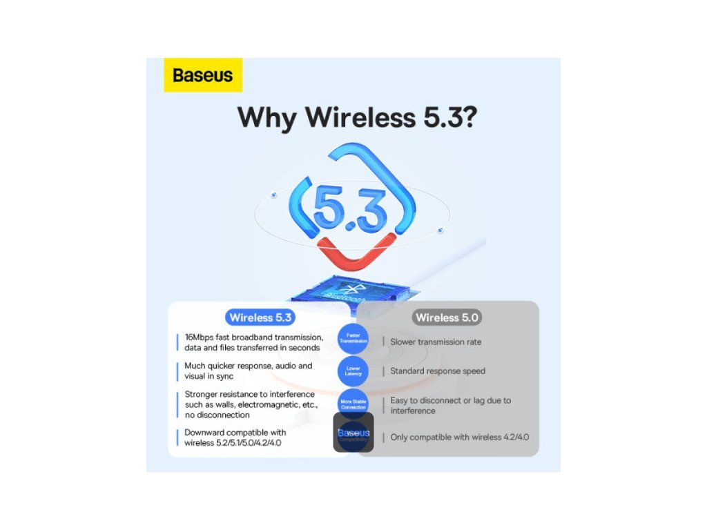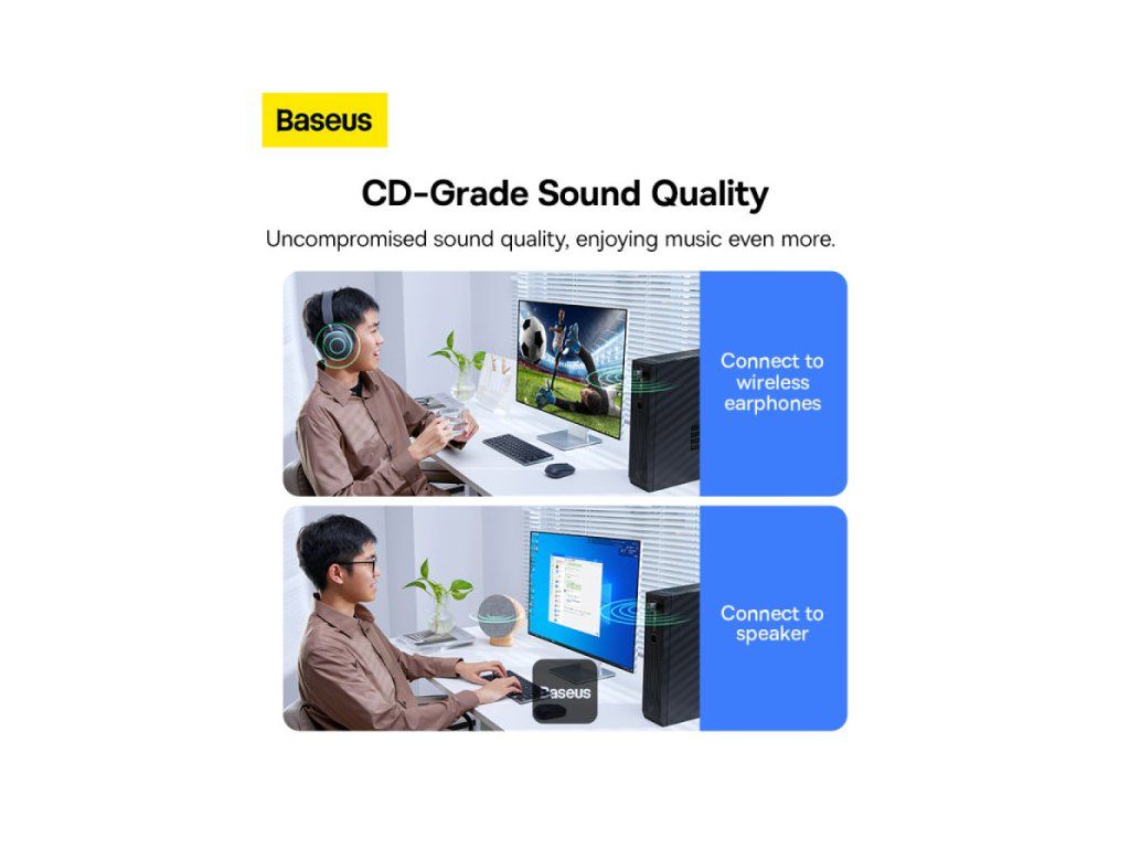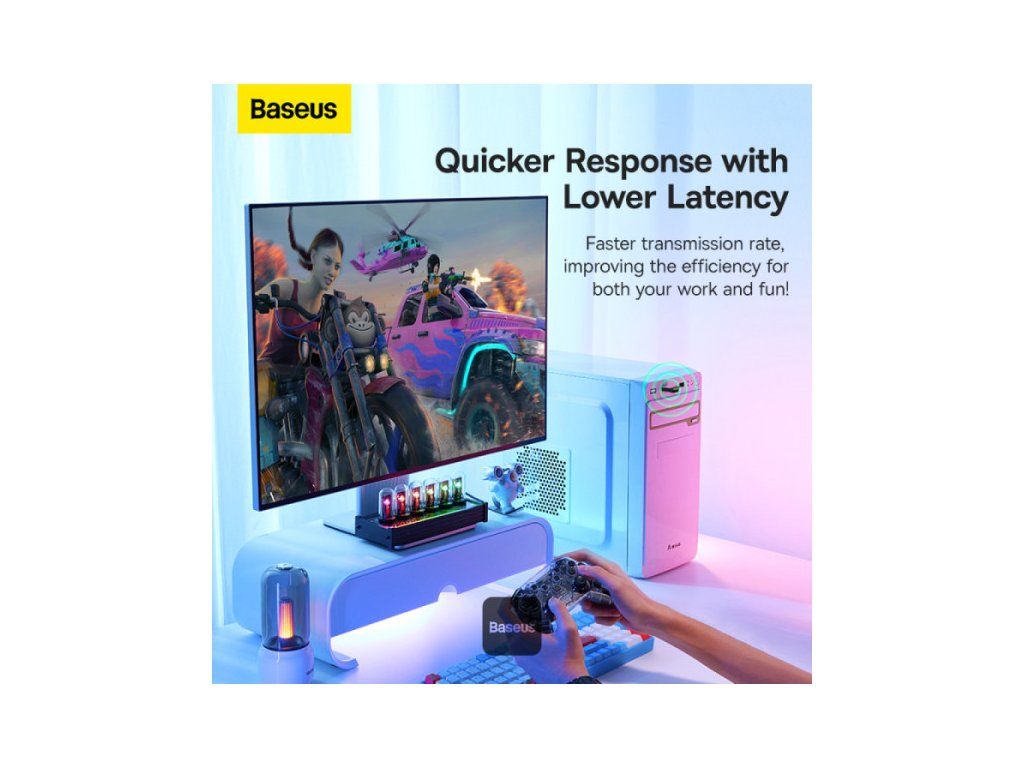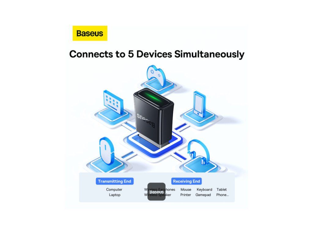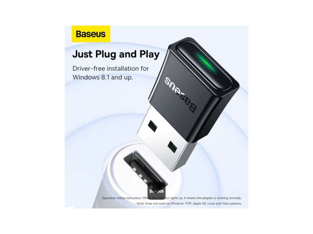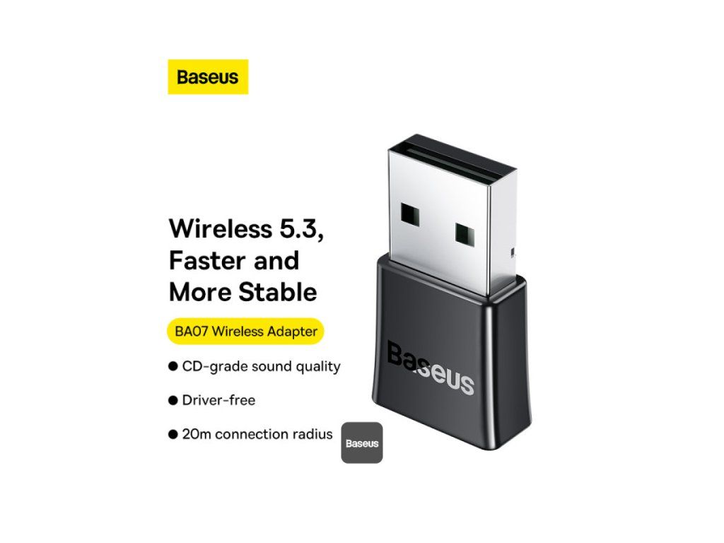 Baseus BA07 Mini Bluetooth adaptér pro PC, USB 5.3 Wireless Bluetooth Dongle Receiver – černý * Bluetooth 5.3 pro zvýšený výkon: Zajišťuje rychlou odezvu, stabilní připojení a sníženou latenci. * Přenosová rychlost 16 Mbps, dosah 20 m: Rychlý přenos dat a prodloužená přenosová vzdálenost. * Snadné Plug & Play: Kompatibilní s Windows 8.1, 10 a 11 bez dalších ovladačů. * Kompaktní, nenápadný design: Nízkoprofilový design, který neblokuje jiné porty USB. * Připojuje až 5 zařízení: Podporuje více periferních zařízení, jako jsou sluchátka, reproduktory, klávesnice a ovladače. * Špičková kvalita zvuku Hi-Fi: Užijte si čistý, přirozený zvuk hudby a multimédií.