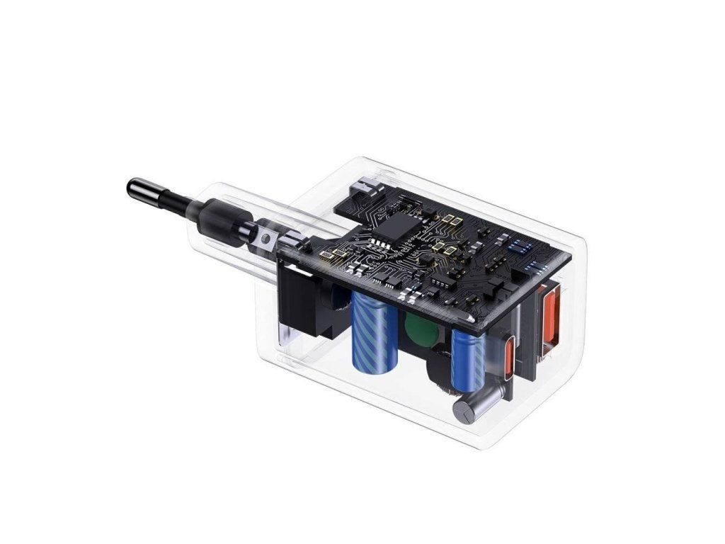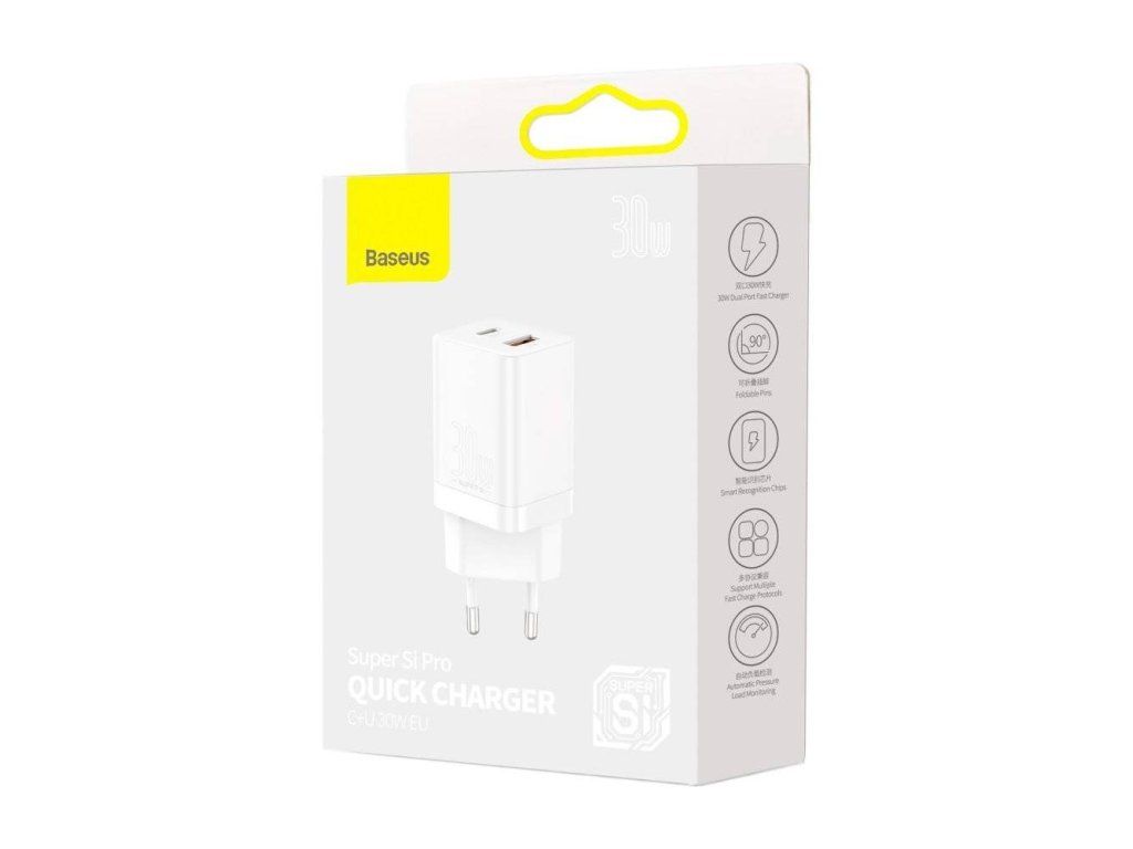 Popis produktu: Baseus CCSUPP-E02 Super PRO Fast nabíječka USB + USB-C PD 30W / QC Rychlonabíječka s duálním USB + USB-C PD výstupem, může nabíjet dvě zařízení současně Kompatibilní s několika protokoly rychlého nabíjení, jako je QC3.0, Power Delivery a vysoký výkon 30W Funkce chytrého vypnutí, proud inteligentně řízen, po plném nabití dojde k odpojení Vlastnosti - Vstup: AC 100-240V 50-60Hz 0,7A - USB-C Výstup: 5 V / 3 A, 9 V / 3 A, 12 V / 2,5 A , 15 V / 2A , 20V / 1,5A - USB 2 Výstup: 5 V / 3 A, 9 V / 3 A, 12 V / 2,5 A , 15 V / 2A , 20V / 1,5A - Celkový výstup: 12W + 18WDodatočné parametre
