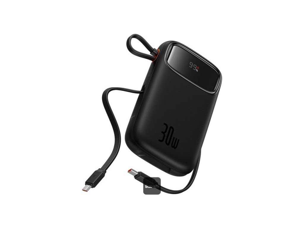 Baseus QPow2 10000mAh Digital Display Fast Charge Power Bank 30W s vestavěným duálním kabelem typu C - černý * Kapacita 10000 mAh pro nabíjení více zařízení * 30W rychlé nabíjení s podporou PD3.0 a QC3.0 * Digitální LED displej baterie pro sledování úrovně energie * Nabíjení více zařízení: Nabíjení 3 zařízení najednou pomocí portů USB-C a USB-A * Elegantní a odolný design s pláštěm z hliníkové slitiny odolným proti poškrábání * Bezpečnostní prvky: Nadproudová, zkratová a přepěťová ochrana