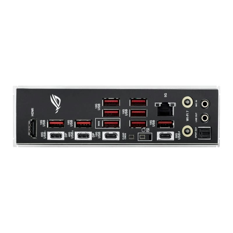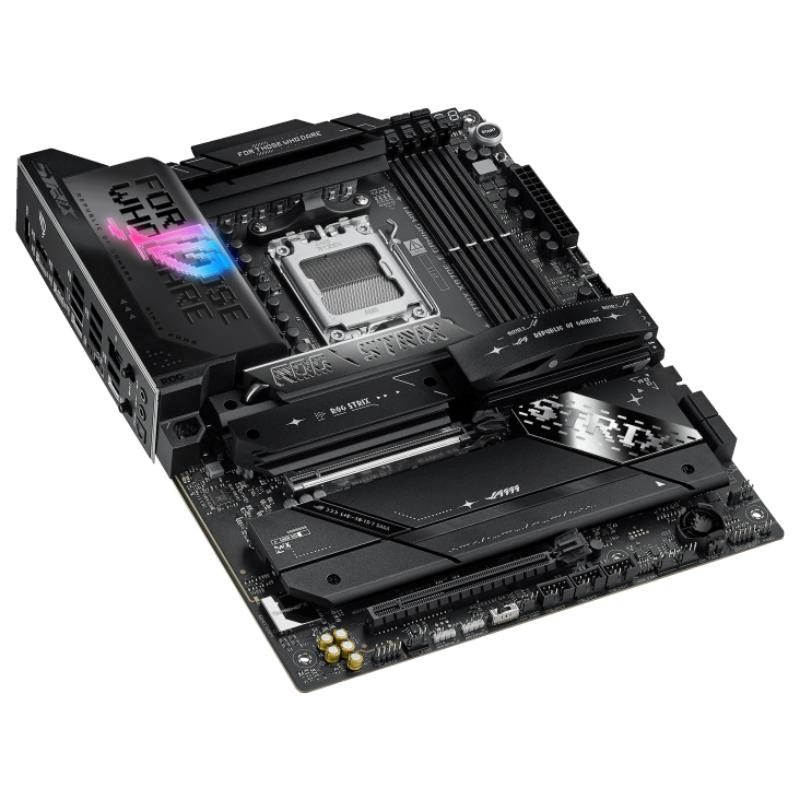 Diagonalne mriežky, brúsená hliníková povrchová úprava a výrazné RGB sa stali charakteristickými znakmi estetiky ROG a Strix X870E-E ich hrdo nesie. No pre túto generáciu majú priepustné difuzéry, ktoré lemujú kryt I/O a Q-Release pole, jemne kontrastujúc s blízko umiestnenými kovovými chladičmi.