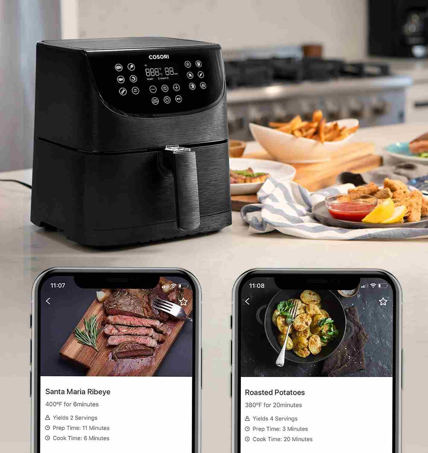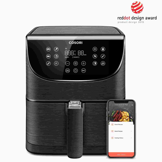 Teplovzdušná fritéza COSORI CP158-AF má 6l varný priestor a 5,5l kôš s praktickým štvorcovým tvarom, vďaka čomu uspokojí aj početnejšie domácnosti. S výkonom 1700 W je fritéza extrémne výkonná, čo skracuje dobu varenia a šetrí tak elektrickú energiu. Vďaka veľkosti varného priestoru fritézy je možné pripraviť napríklad aj celé 3kg kura v kuse, ktoré by sa do fritézy s kruhovým košom alebo objemom 3-4l zmestilo len veľmi ťažko.