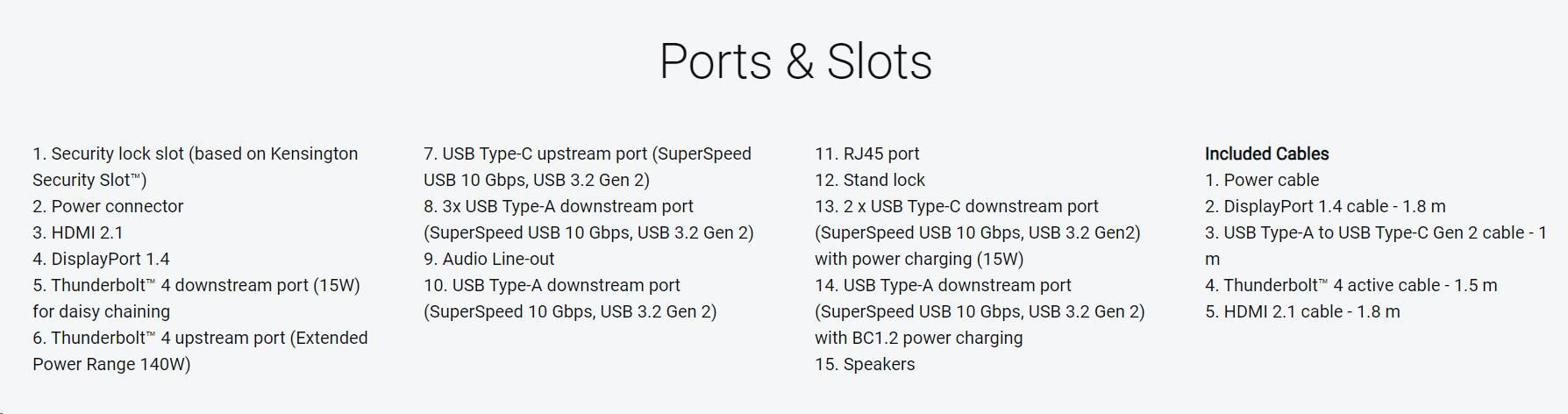 - 1 x ThunderboltTM 4 (Až 140W EPR) (Alternatívny režim s DisplayPort 1.4, SuperSpeed USB 3.2 Gen2 (10 Gbps) upstream port, USB Power Delivery až 140W EPR)