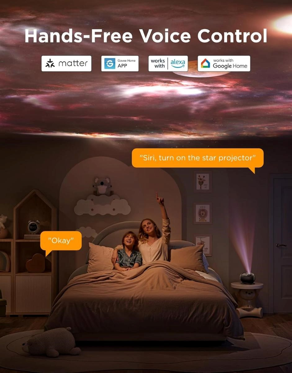 Vďaka pokročilým funkciám sa Govee Galaxy Light Projector 2 Pro ľahko stane súčasťou vášho chytrého domu. Podpora Matter, Alexa aj Google Assistant znamená plnú kompatibilitu a rýchle hlasové ovládanie. Pomocou aplikácie Govee Home môžete okamžite prepínať medzi obľúbenými scénami, nastaviť jas alebo zmeniť motív. To všetko bez zložitých nastavení, s možnosťou prispôsobiť si atmosféru na mieru jedným dotykom.