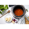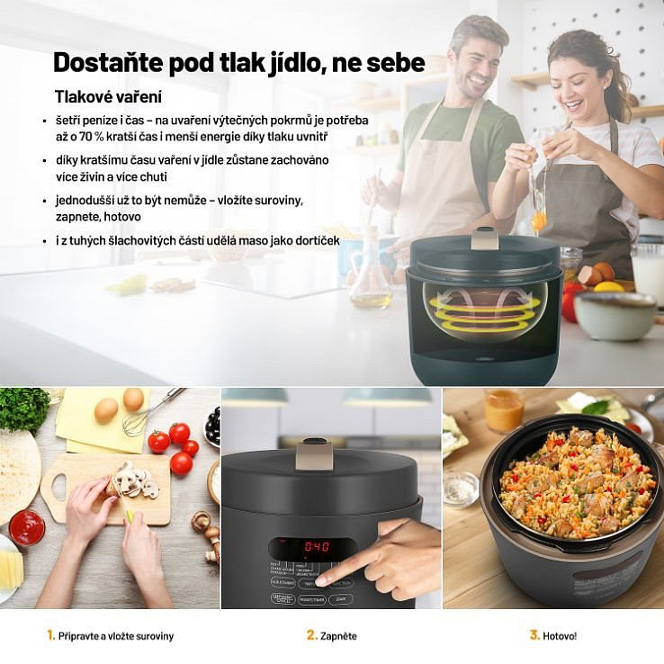 Prístroj disponuje 9 prednastavenými programami - ryža, hrubé obilniny, porridge , bravčové, kurča, strukoviny/šľachovité mäso, rýchla omáčka, polievka, ohrev. Všetky suroviny iba vložíte do tlakového hrnca, uzavriete a navolíte príslušný program. Podobne máte možnosť vybrať si z 3 úrovní štruktúry mäsa, tuhá až mäkká. Čas varenia je možné upraviť aj manuálne. Vďaka funkcii Keep Warm udržíte jedlo teplé aj pre oneskorencov. Funkcia odloženého štartu zase pomôže, aby ste po príchode domov mali jedlo už hotové.