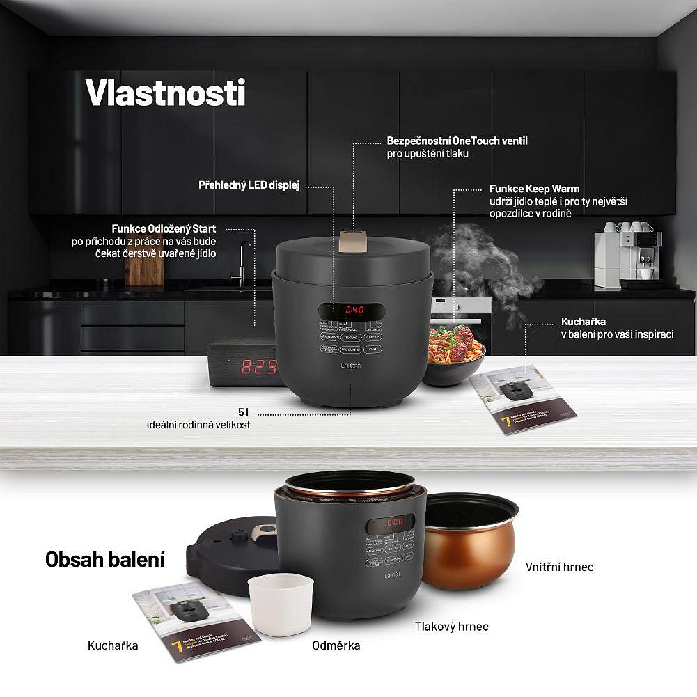 Keď mu zvýšite tlak, ušetríte časTlakové hrnce bývali vždy vítanými, ale tiež obávanými spoločníkmi v domácnosti. Energeticky úsporný viacúčelový elektrický tlakový hrniec Lauben Electric Pressure Cooker 5000AT má všetky výhody tzv. papiňáka a ešte niečo naviac a v modernom a bezpečnom šate. Čas aj peniaze šetrí kratšia doba prípravy vďaka tlaku vo vnútri a navyše sa takto zachová v jedle viac živín. Aj keď nie ste kuchársky majster, obľúbite si fakt, že do hrnca stačí dať suroviny, zapnúť ho a on sa o všetko postará. Hrniec disponuje 9 prednastavenými programami a 3 úrovňami požadovanej štruktúry mäsa. Čas prípravy nastavíte aj manuálne. 5l objem stačí pre celú rodinu, údržba je jednoduchá, bezpečnosť zaisťuje One Touch ventil pre vypustenie tlaku. Jedlo udrží teplé funkcia Keep Warm, lepšie plánovanie umožní odložený štart. Balenie obsahuje tiež kuchárku.