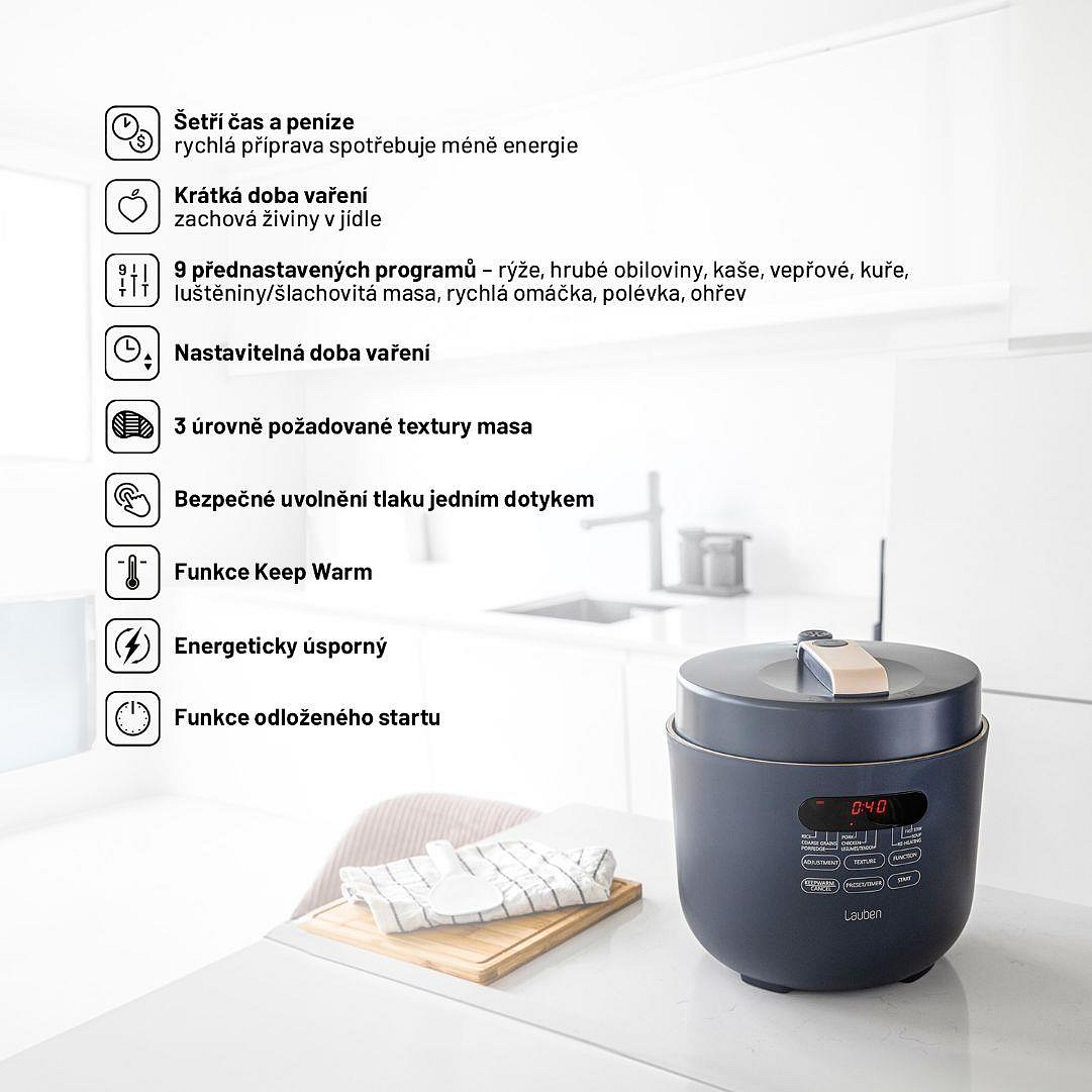 Viacúčelový a energeticky úsporný elektrický tlakový hrniec Lauben Electric Pressure Cooker 5000AT vie vďaka tlaku vo vnútri pripraviť chutné pokrmy za rekordne krátku dobu. Čas, ktorý ušetríte, tak môžete venovať sebe či rodine. Zároveň ušetríte aj peniaze, pretože spotreba energie je pri tomto spôsobe varenia nižšia. Kratšia príprava prospieva aj surovinám, ktoré si uchovávajú viac živín. Stačí pritom jediné, vložiť všetko potrebné do hrnca, zavrieť, zapnúť a o všetko ostatné sa už prístroj postará sám.